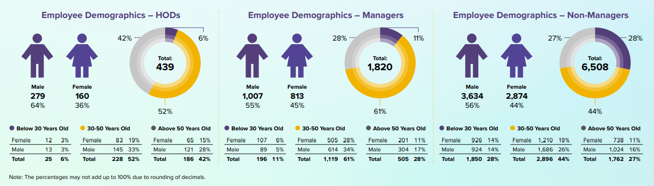 Diversity, Equity and Inclusion (DEI) practices are crucial to ensure a diverse range of perspectives, enhance employee engagement and foster innovation. At CDL Group, women make up a significant 45% of our global workforce, representing 40% of our HODs. At the Company’s corporate office, women make up 68% of our workforce and 45% of our HODs. The Group also has a diversified workforce across all age groups.