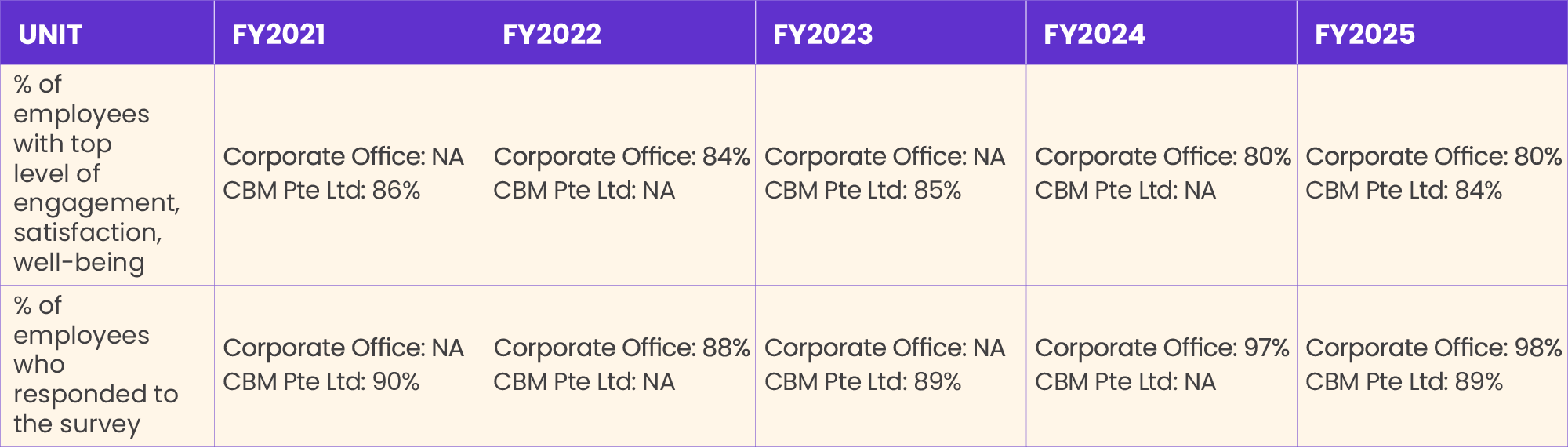 Biennial employee engagement surveys (EES) are conducted by the Company’s corporate office and CBM Pte Ltd. An Employee Engagement Pulse Survey (EEPS) is held by our corporate office every alternate year from the EES. Last held in 2025, the Company’s EEPS engagement score was 80%, with a participation rate of 98%. CBM Pte Ltd last held its employee engagement survey in 2025, achieving an engagement score of 84%, with a participation rate of 89%. Survey questions cover areas such as wellbeing of employees, job motivation and satisfaction, and work productivity.