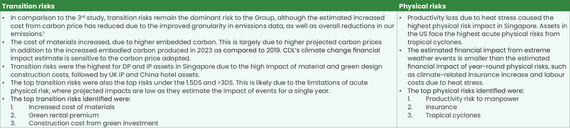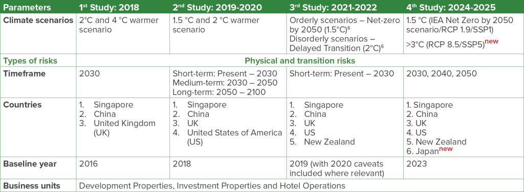 Since we adopted the Task Force on Climate-Related Financial Disclosures (TCFD) Recommendations in 2017, CDL has conducted a total of four climate change scenario analyses. The climate change scenario analysis, which is now a recommendation of the International Financial Reporting Standards (IFRS) S2, aids corporates in understanding the strategic implications of climate-related risks and opportunities.