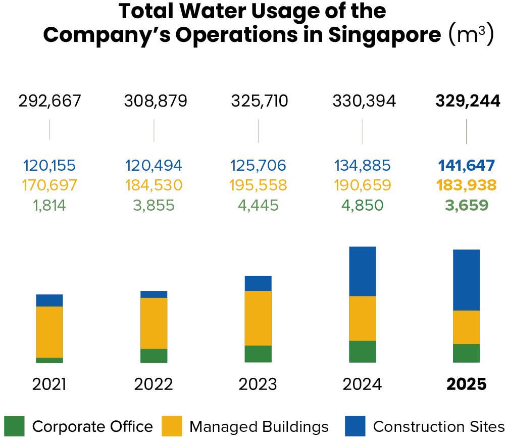 Effective water management is critical to our operations, which are water-intensive and reliant on a stable supply. We take a holistic approach to enhance the efficiency, resilience and value of our assets through sound water management practices, ensuring reliable supply and cost savings for homeowners and tenants. Within our managed buildings, the Company draws both potable and NEWater (for non-potable use) from PUB’s utility network, for building operations and maintenance activities. For commercial buildings, water is utilised for cooling towers, toilets, pantries, water features, irrigation and washing activities. At our construction sites, potable water is used mostly by our contractors for sanitation purposes.