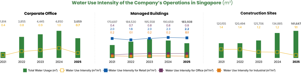 Water intensity for our corporate office and construction sites saw a slight decrease in 2025, due to the increase in floor area under construction. We continue to actively work towards optimising water use. For our managed buildings, we are encouraged to report a modest reduction in water use intensity compared to 2024, demonstrating our ongoing commitment to improving water efficiency.