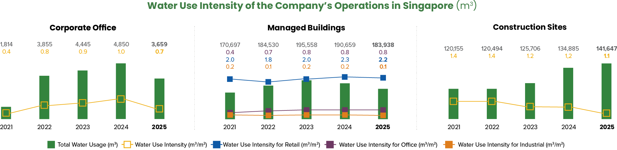 Water intensity for our corporate office and construction sites saw a slight decrease in 2025, due to the increase in floor area under construction. We continue to actively work towards optimising water use. For our managed buildings, we are encouraged to report a modest reduction in water use intensity compared to 2024, demonstrating our ongoing commitment to improving water efficiency.