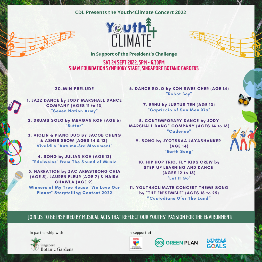 In celebration of the Ministry of Sustainability and the Environment’s (MSE) Climate Action Week 2022, CDL’s Youth4Climate Concert came back for its fifth edition this year at the Shaw Foundation Symphony Stage in the Singapore Botanic Gardens! The concert served as a finale to the action-packed week rallying people and communities to drive change.
