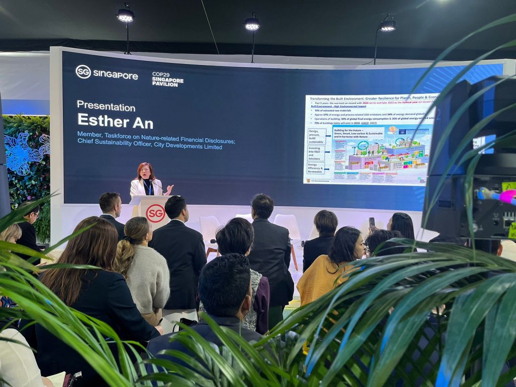 - At COP29, CDL’s Chief Sustianability Officer Ms Esther An had an intensive 3-day participation sharing on topics such as greening the built environment, nature-based solutions to complement technologies as well as energy solutions as key to fast-forwarding action towards sustainable cities and planet: