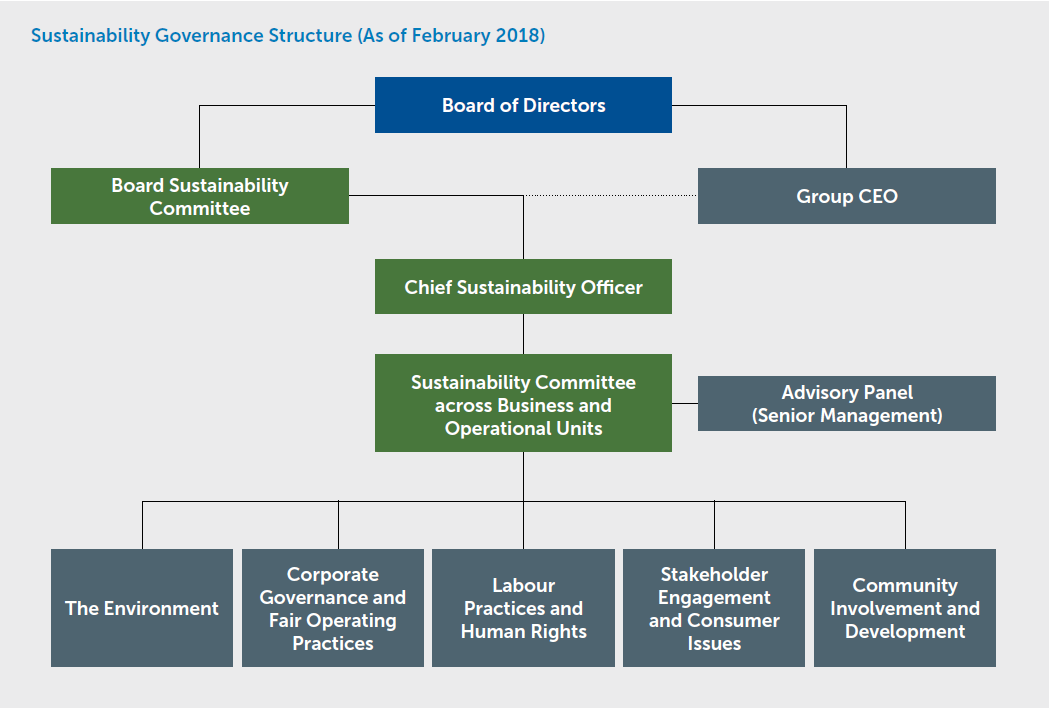 Above this operational-level Committee sits a Board Sustainability Committee (BSC) which advises on CDL’s sustainability strategy. Since February 2018, the BSC has played a bigger role in advancing CDL’s sustainability leadership as the Sustainability function reports directly to the board-level Committee and administratively to the Group CEO.
