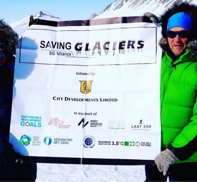 At the end of the launch, CDL Group CEO and Executive Director Mr Sherman Kwek presented the “Saving Glaciers Alliance” flag to Sir Robert, which Sir Robert proudly waved on his expedition in Antarctica. To hear Sir Robert give us a shoutout whilst in action, please click here.