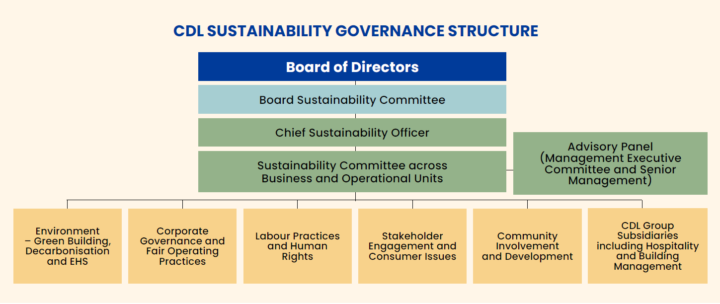 Sustainability does not work in silos in CDL. The Management Executive Committee (ExCo) and the senior management of all business units are well informed of the Company’s sustainability initiatives and progress towards ESG targets, achievements and challenges at monthly CDL senior management meetings. The Company’s sustainability governance and management are in line with or ahead of the best global practices and SGX RegCo’s mandate on climate disclosures and board supervision. To achieve effective integration of sustainability throughout the Company, the CSO chairs the Sustainability Committee, which comprises members across all business units.