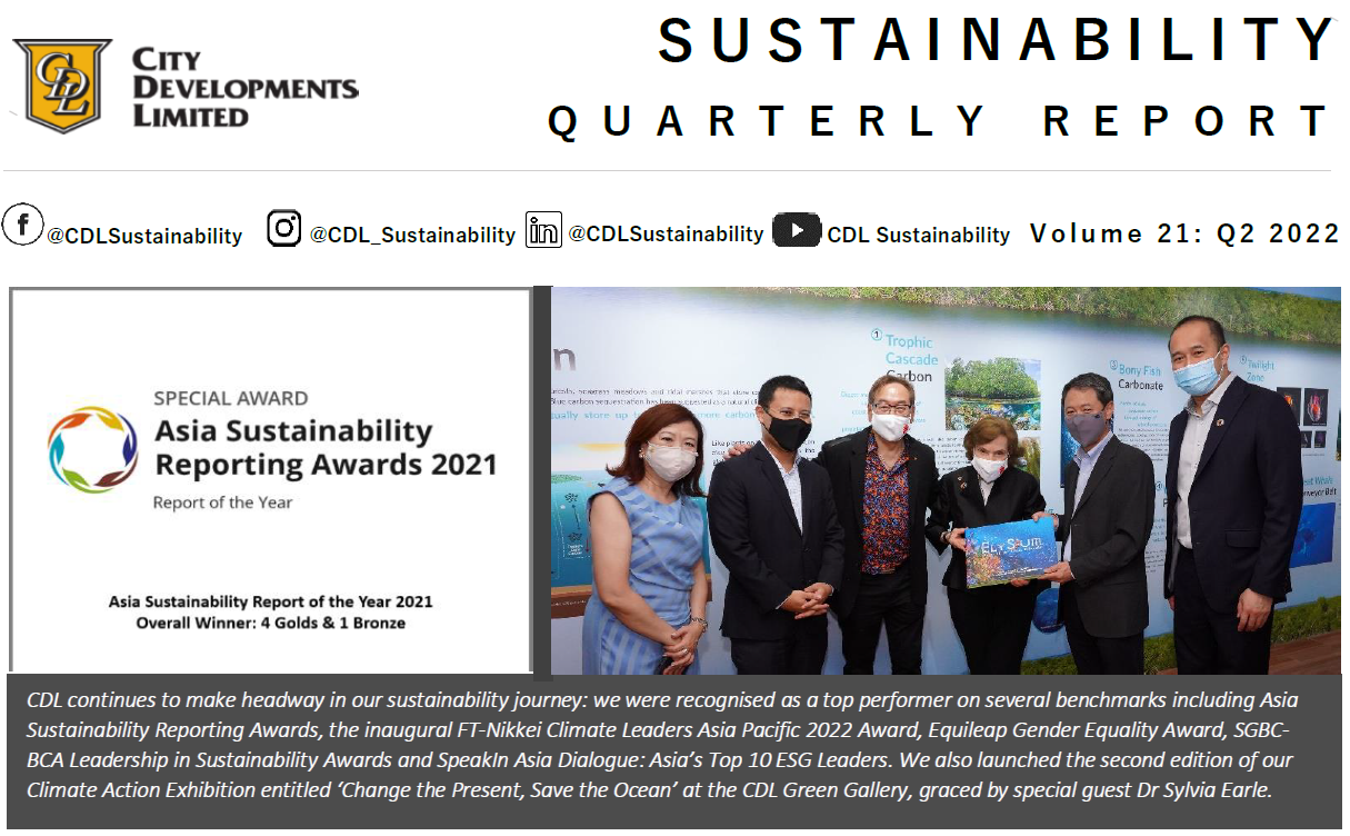 Being the forerunner in sustainability reporting since 2007, CDL is firmly committed to aligning with the global call for prompt and transparent climate-related disclosure. In addition to our annual Integrated Sustainability Report, CDL voluntarily provides quarterly updates on our sustainability-related initiatives and key ESG performance measured against our 2030 goals and targets.