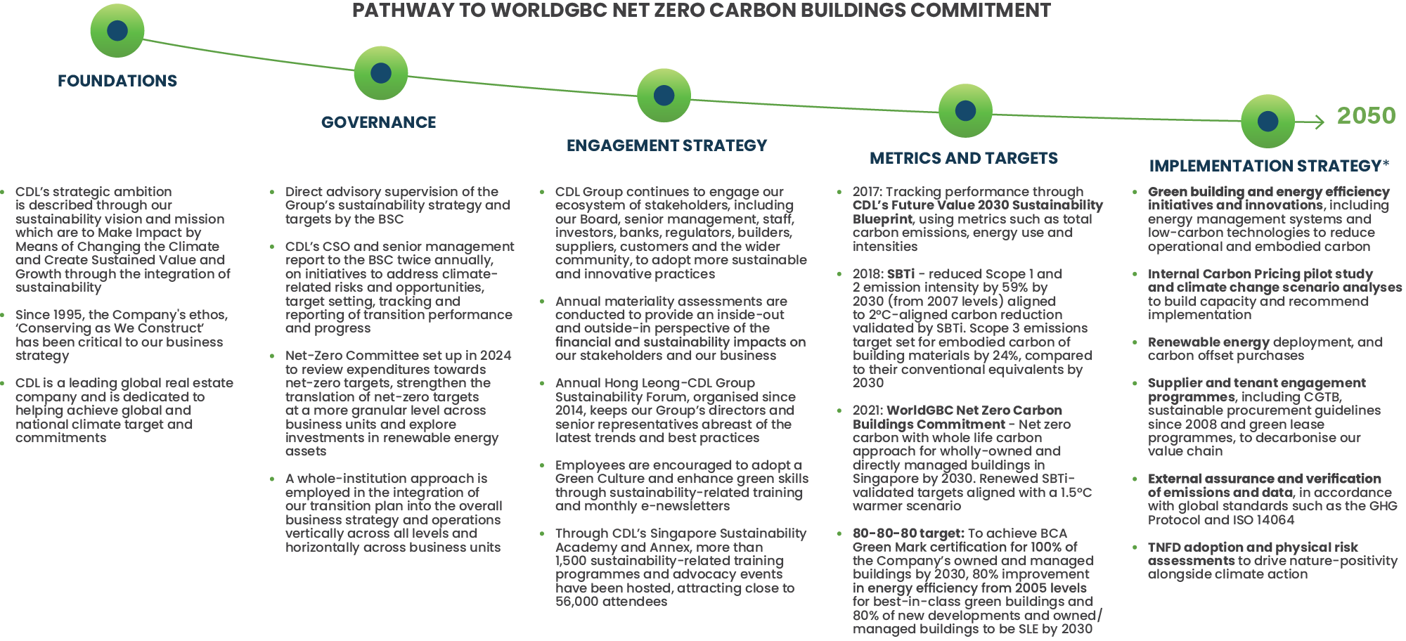 CDL Group’s Climate Transition Plan sets out our strategic ambition to integrate sustainability into our business model and value chain. This includes implementation, engagement efforts, setting metrics and targets towards a successful transition, and Board level oversight. The plan comprises the five elements: Foundations, Governance, Engagement Strategy, Metrics and Targets, and Implementation Strategy, and details the Group’s efforts towards a net-zero, 1.5°C pathway and restoration of natural ecosystems. It is also aligned with the GFANZ and TPT frameworks.