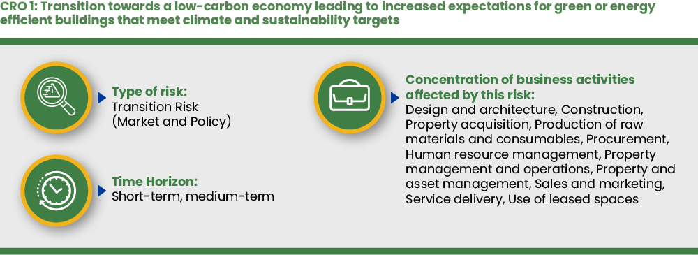 1 Transition towards a low-carbon economy leading to increased expectations for green or energy-efficient buildings that meet sustainability targets for buildings Energy Efficiency and Adoption of Renewables, Green and Healthy Buildings All Design and architecture, Construction, Property acquisition, Production of raw materials and consumables, Procurement, Human resource management, Property management and operations, Property and asset management, Sales and marketing, Service delivery, Use of leased spaces Short-term, medium-term