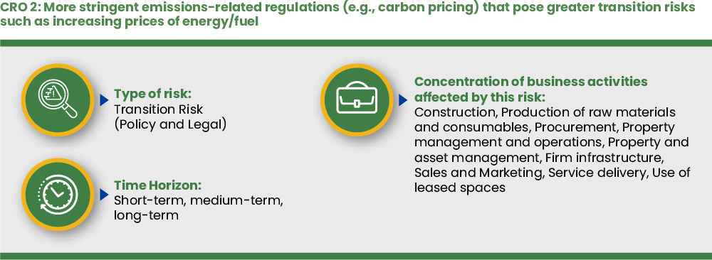 3 Increasingly stringent emissions-related regulations (e.g., carbon pricing) that present transition risks such as increasing prices of energy/fuel Energy Efficiency and Adoption of Renewables, Responsible Supply Chain, Climate Resilience and Adaptation All Construction, Production of raw materials and consumables, Procurement, Property management and operations, Property and asset management, Firm infrastructure, Sales and marketing, Service delivery, Use of leased spaces Short-term, medium-term, long-term