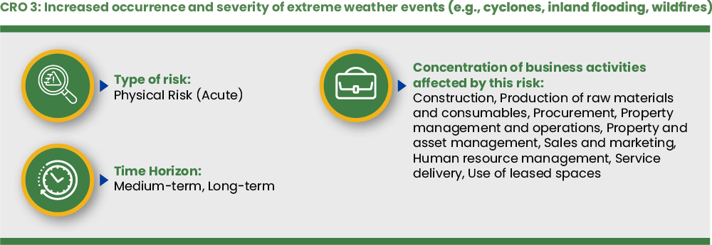 2 Increased occurrence and severity of extreme weather events (e.g., cyclones, inland flooding, wildfires) Climate Resilience and Adaptation, Governance and Business Conduct, Occupational Health, Safety and Well-being All Construction, Production of raw materials and consumables, Procurement, Property management and operations, Property and asset management, Sales and marketing, Human resource management, Service delivery, Use of leased spaces Medium-term, long-term