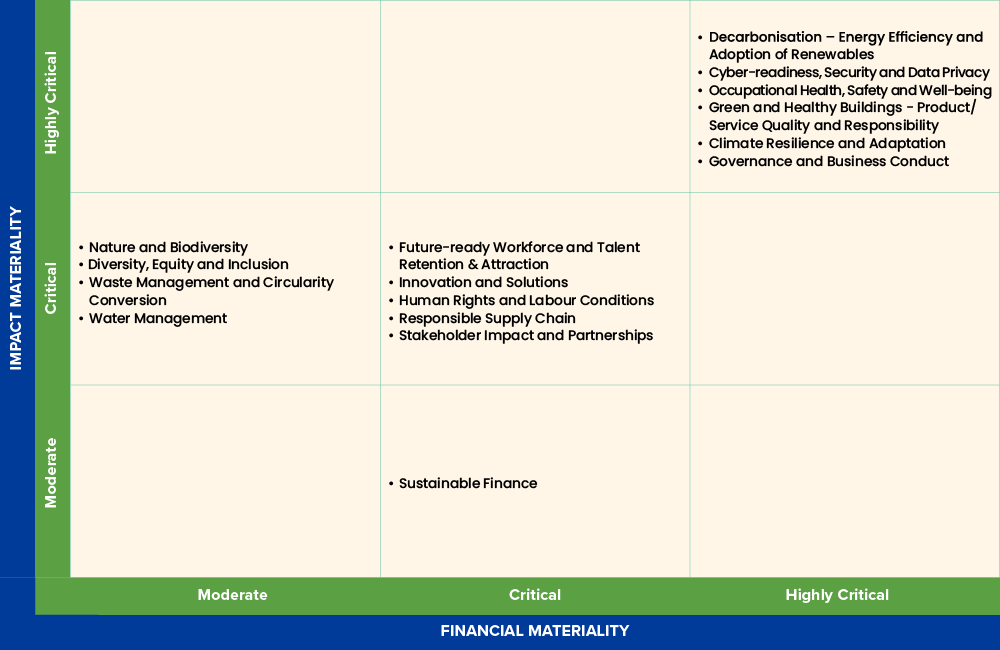 With the urgency of the global energy transition, “Decarbonisation – Energy Efficiency and Adoption of Renewables” remained the top materiality issue in 2025. “Cyber-readiness, Security and Data Privacy” continues to be the 2nd materiality issue, with growing cyber risks of misinformation and disinformation threatening supply chains and financial stability.1 “Green and Healthy Buildings – Product/Service Quality and Responsibility” rose to take 3rd place. All material topics have been categorised either as “Moderate”, “Critical” or “Highly Critical”, signaling that CDL views sustainability as a critical subject across our business and operations.2